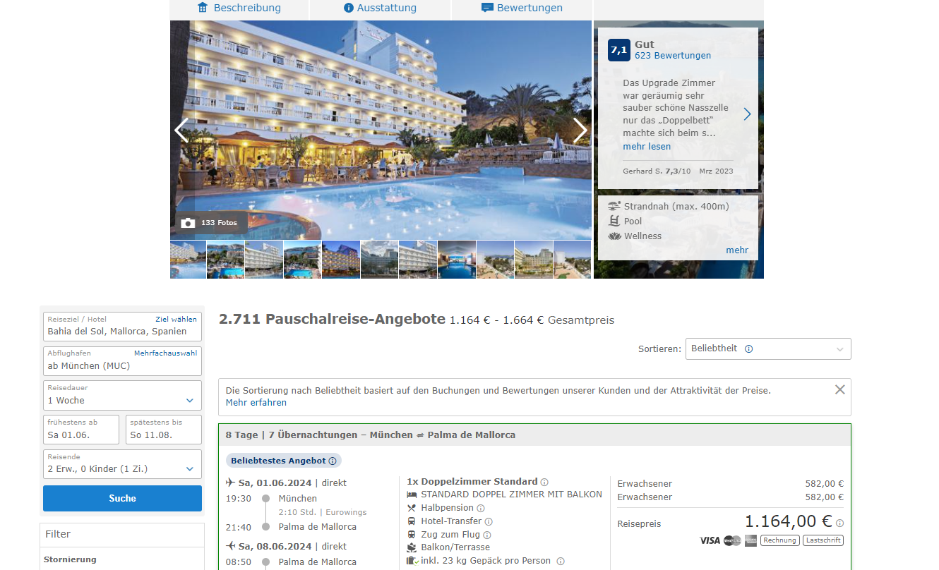 Liebe Rosi-Schnäppchenjäger aufgepasst! Falls du schon immer von einer Reise nach Mallorca geträumt hast, dann hat Check24 derzeit ein fantastisches Sommerangebot für die traumhafte Baleareninsel Mallorca. Eine Woche im 4-Sterne-Hotel Bahia Del Sol, inklusive Hin- und Rückflug, Transfer sowie Unterkunft mit Halbpension, erwartet dich bereits ab 582 € pro Person.