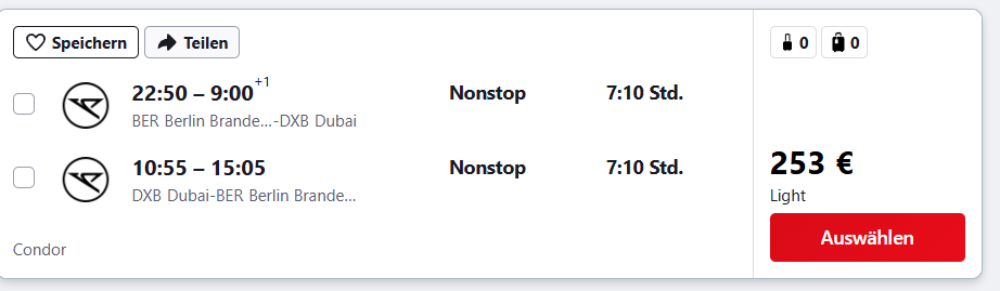 Wer dem deutschen Winter entfliehen möchte, hat jetzt die perfekte Gelegenheit: Condor (aber auch Eurowings) bietet derzeit attraktive Direktflüge ins sonnige Dubai – und das bereits ab 253 € p.P. ! Ab Berlin und Stuttgart geht es nonstop in die Vereinigten Arabischen Emirate 🇦🇪 – ganz ohne Umstieg und zur besten Reisezeit zwischen November und Januar.