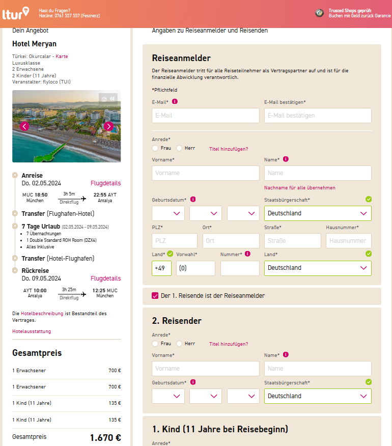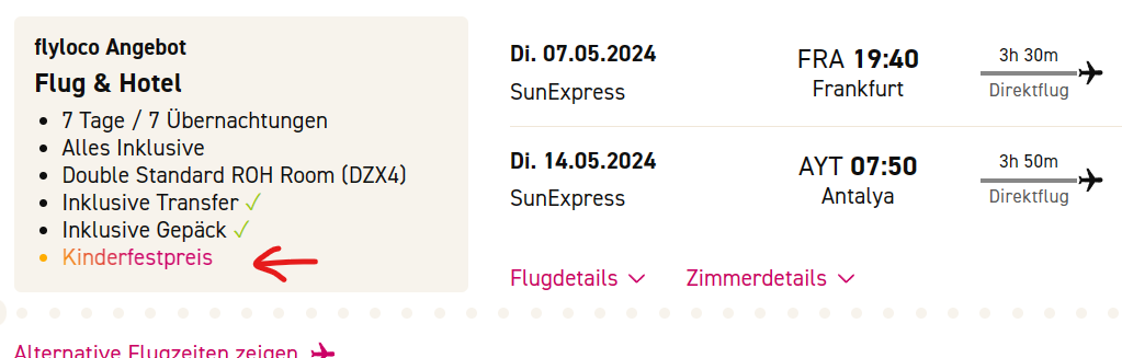 Für den genauen Familienpreis einfach das Alter der Kinder eingeben, Wunschtermin und Abflughafen ergänzen und in wenigen Sekunden wird der Familienpreis angezeigt. Als Beispiel haben wir 2 Erwachsene und 2 Kinder abgefragt und für eine Woche mit Flug schon ein Deal unter 1700 € pro Familie gefunden.