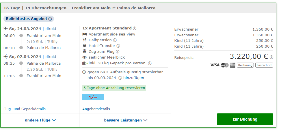 Einfach mal das Angebot anschauen: In diesem Beispiel haben wir 2 Erwachsene und 2 Kinder (11 Jahre) in den Osterferien ausgewählt.